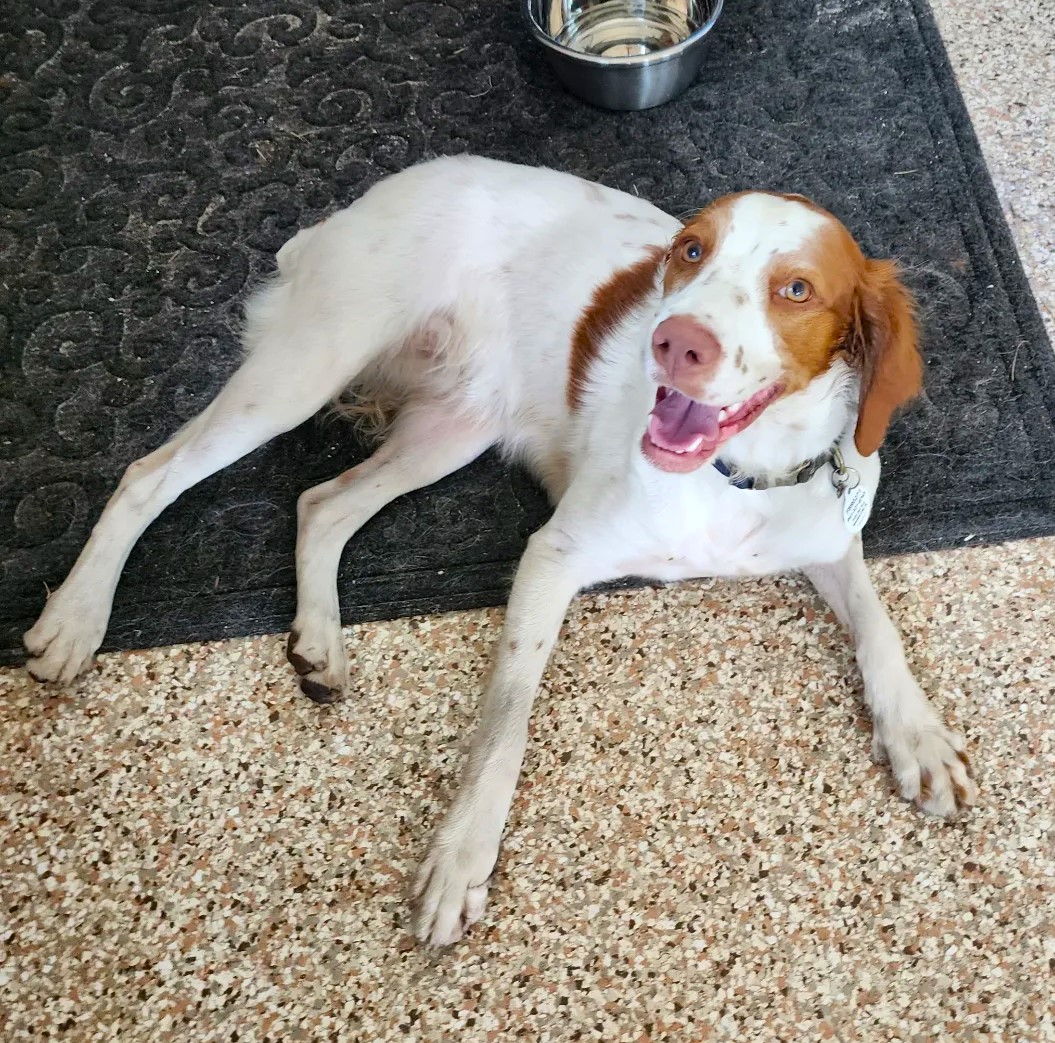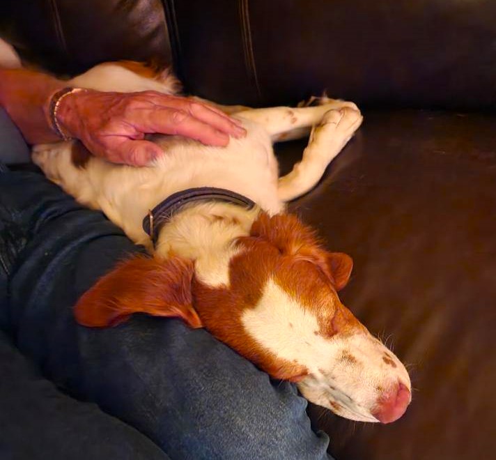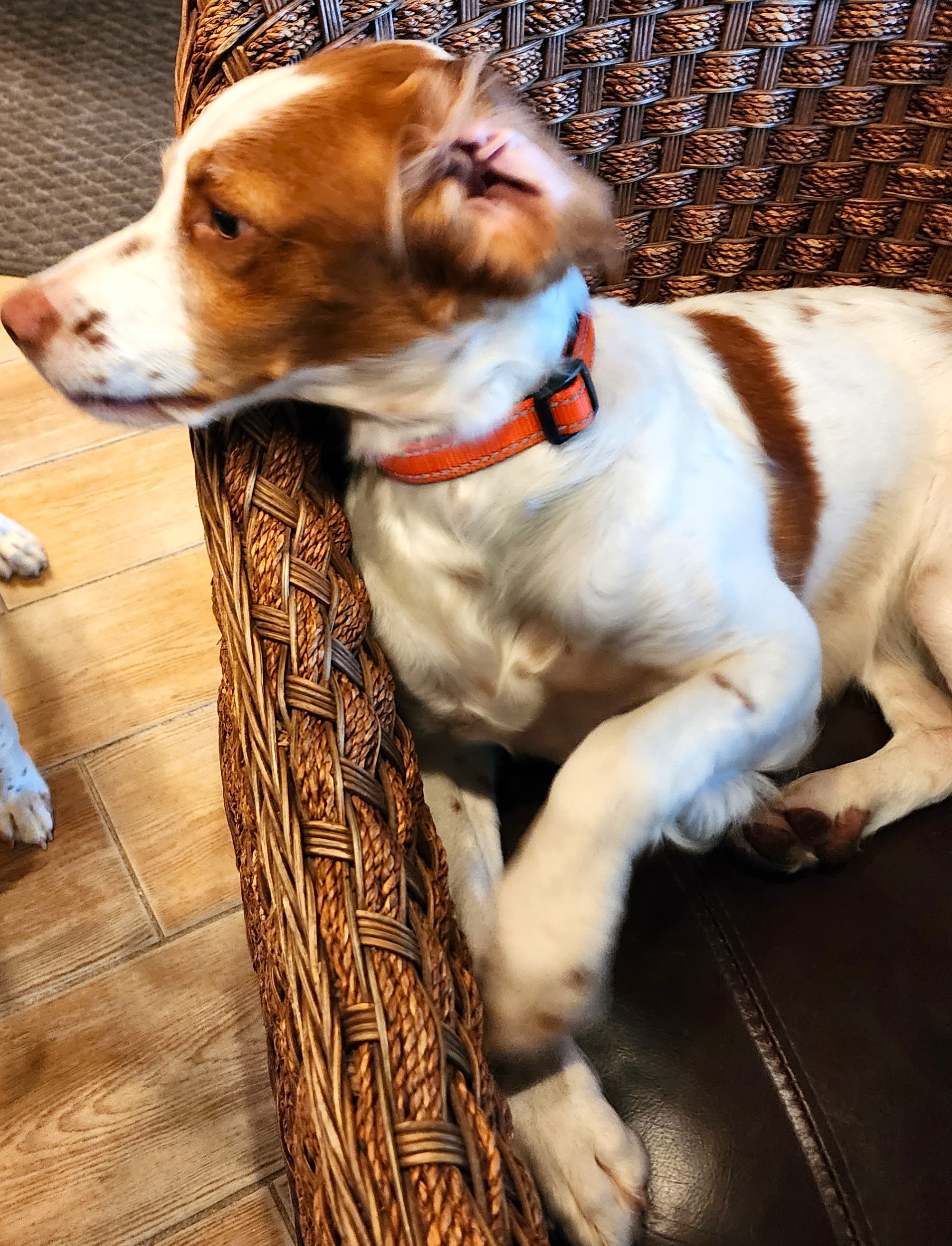 She trains well and has good eye contact, very treat motivated when she trusts you. Her athletic ability is just beautiful to watch. She has a dainty Brittany trot. When she runs flat out, she springs into the air so she can be faster than the other Brittanys in her foster home.